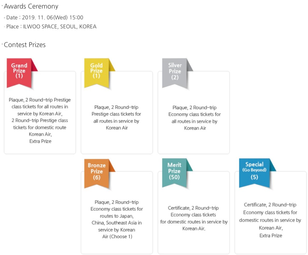 작년 기준으로 1등은 모든 구간을 이용할 수 있는 프레스티지 왕복 항공권 2장과 국내 왕복 항공권 2장을 주었다. (국내 항공권도 역시 프레스티지 등급이다)