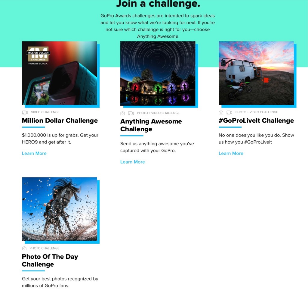 위에 언급한 링크를 클릭하면 고프로에서 주최하는 챌린지를 볼 수 있다. Million Dollar Challenge를 제외하고는 상금이 명시되어 있는 것 같지는 않다. 하지만 내가 찍은 작품이 고프로 공식 채널에 소개된다는 것만으로도 뭔가 뿌듯할 것 같다.