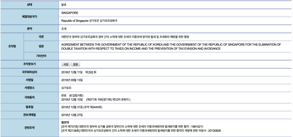 즉 거주하고 있는 나라에 세금을 한번만 납부하면 되는 제도이다. 이건 나라마다 조약이 달라서 내가 속한 회사의 법인 국가랑 조약을 맺었는지 확인이 필요하다.