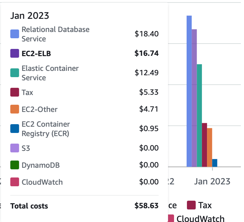 The total cost is approximately $65 per month, with the most expensive service being RDB (using PostgreSQL). Here’s a list of the AWS services I’m using: