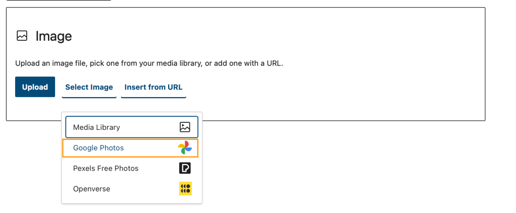 이 방법은 앱이 아닌 웹 브라우저로 워드프레스 사이트로 들어가서 포스팅 하는 경우에만 가능하다. 사진 블록에서 미디어 라이브러리가 아닌 구글 포토를 선택하자.