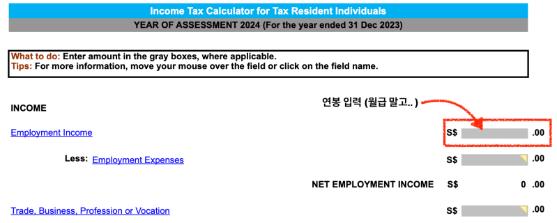 빨간 박스에 본인 연봉을 입력하자. 그러면 하단 NET TAX PAYABLE 에 본인이 내야 될 세금이 나온다. 참고로 싱가포르는 세금을 일시불로 낼 수도 있고 12개월 무이자로 분납할 수도 있다.