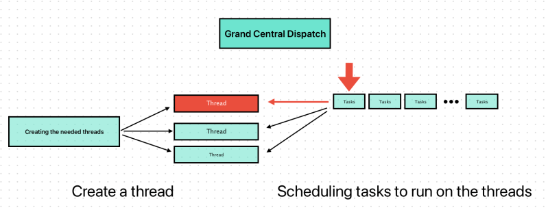 One of the technologies for starting tasks asynchronously is Grand Central Dispatch (GCD). This technology takes the thread management code you would normally write in your own applications and moves that code down to the system level. All you have to do is define the tasks you want to execute and add them to an appropriate dispatch queue. GCD takes care of creating the needed threads and of scheduling your tasks to run on those threads. Because the thread management is now part of the system, GCD provides a holistic approach to task management and execution, providing better efficiency than traditional threads.