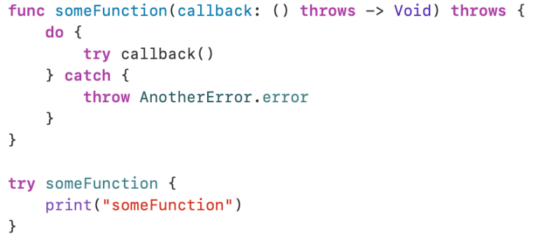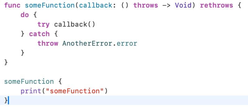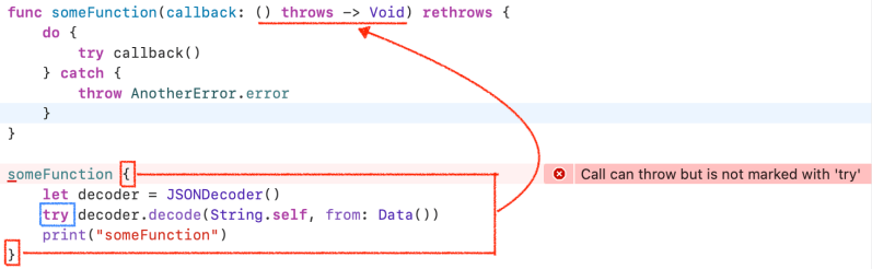 Example 3. This one compile error (A function declared ‘rethrows’ may only throw if its parameter does)