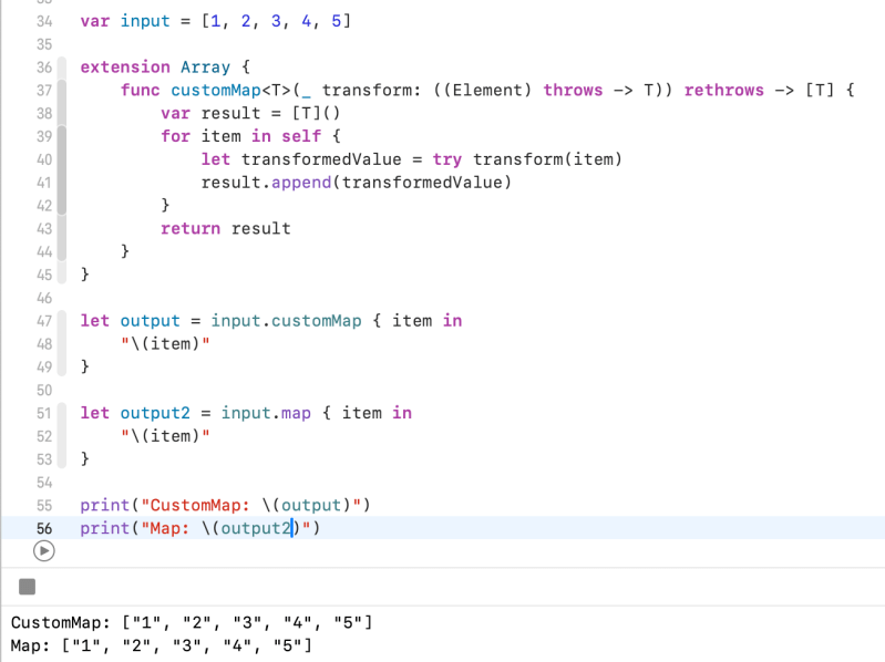 func customMap<T>(_ transform: ((Element) throws -> T)) rethrows -> [T] {
