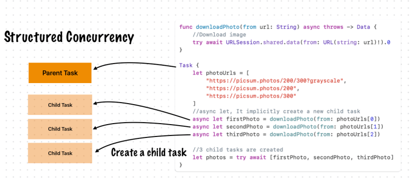 Tasks are arranged in a hierarchy. Each task in a given task group has the same parent task, and each task can have child tasks. Because of the explicit relationship between tasks and task groups, this approach is called structured concurrency. The explicit parent-child relationships between tasks has several advantages: