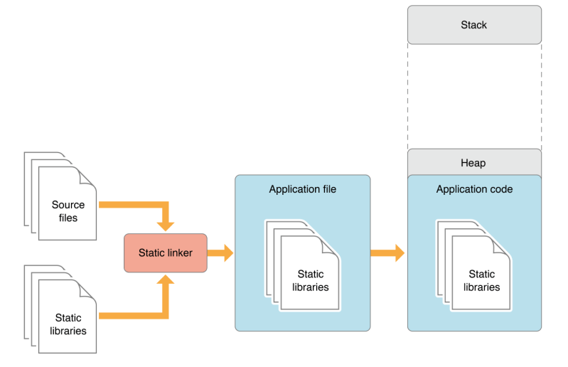 Most of an app’s functionality is implemented in libraries of executable code. When an app is linked with a library using a static linker, the code that the app uses is copied to the generated executable file. A static linker collects compiled source code, known as object code, and library code into one executable file that is loaded into memory in its entirety at runtime. The kind of library that becomes part of an app’s executable file is known as a static library. Static libraries are collections or archives of object files.