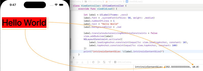 Let’s test. UILabel has 2 constraints which are leading and top. I set font and text. As you can see It’s intrinsicContentSize is based on it’s content.