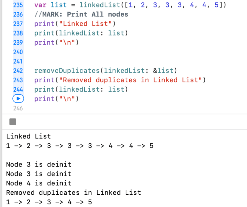 print("Node: \(node!.value), prev: \(node?.prev?.value) next: \(node?.next?.value)", terminator: node?.next == nil ? "" : " <-> ")