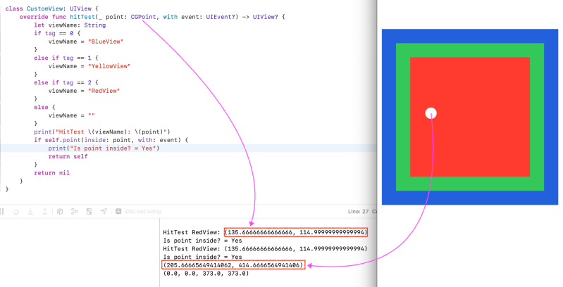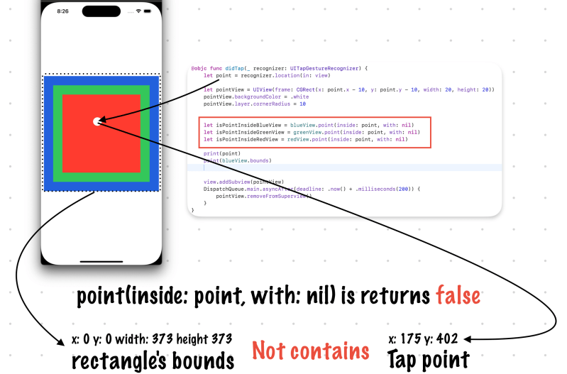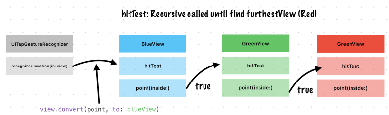 https://developer.apple.com/documentation/uikit/uiview/1622469-hittestpoint(inside:with:)returnstrue, this method continues to traverse the subview hierarchy until it finds the frontmost view that contains the specified point.