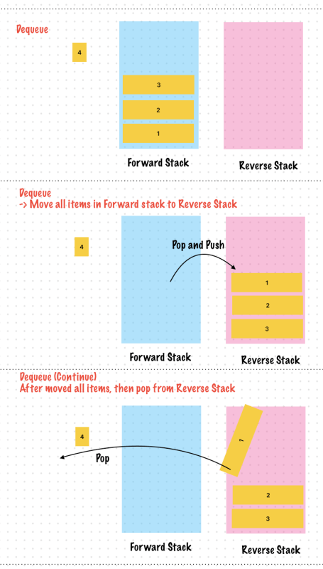 - Dequeue operations are always performed on the reverse stack