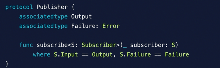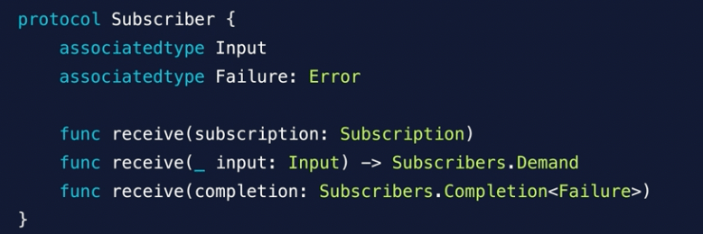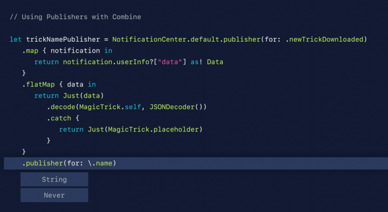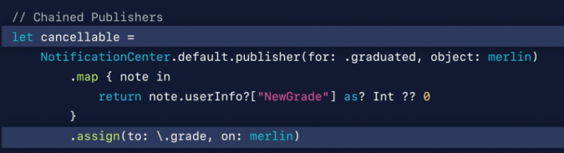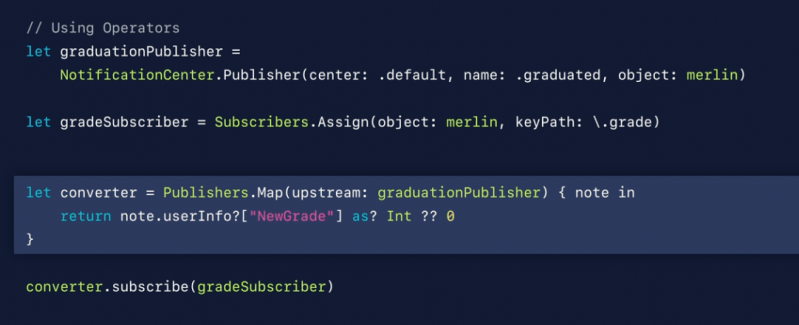 The Combine framework provides a declarative approach for how your app processes events. Rather than potentially implementing multiple delegate callbacks or completion handler closures, you can create a single processing chain for a given event source. Each part of the chain is a Combine operator that performs a distinct action on the elements received from the previous step.