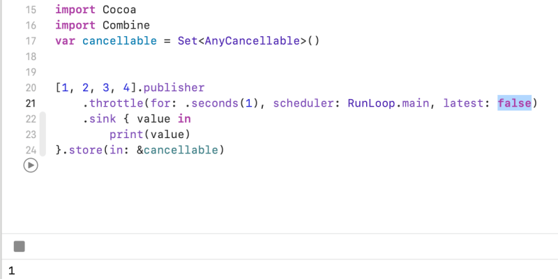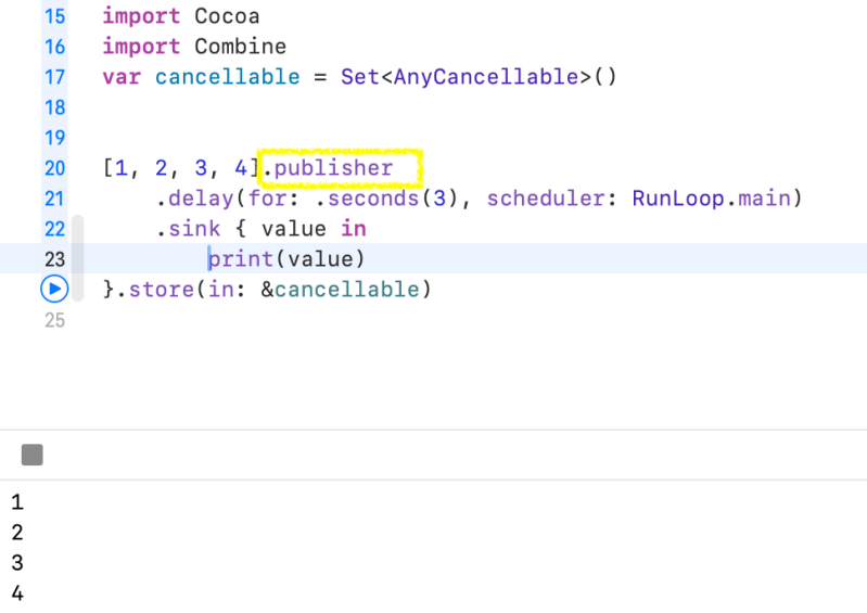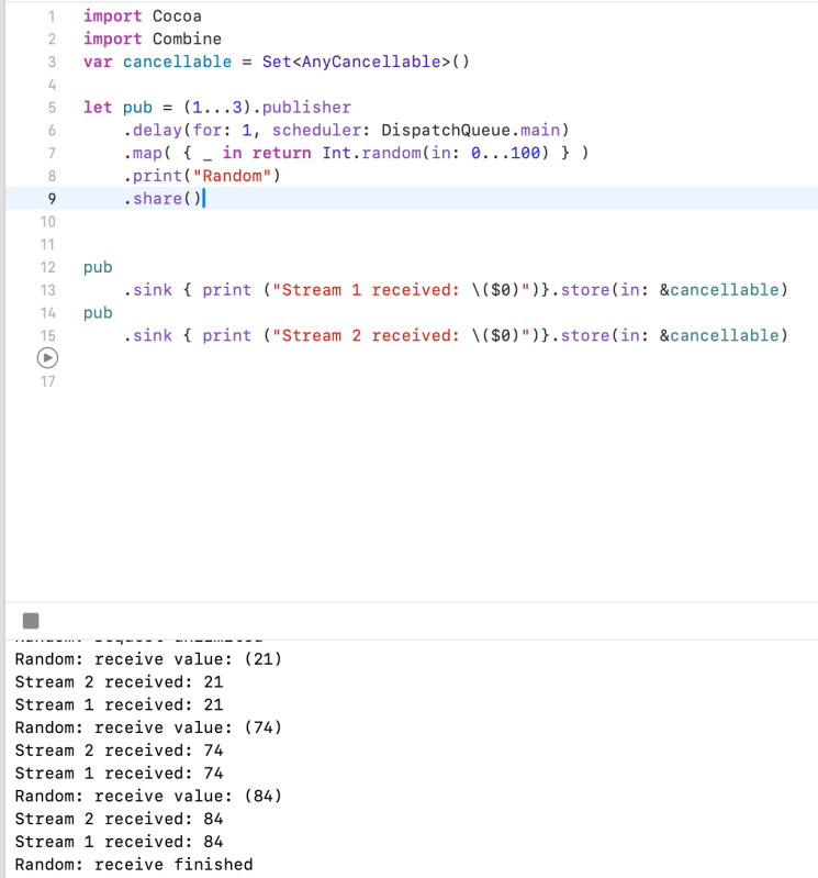 map(_:)operator. It uses ashare()operator to share the same random number to each of two subscribers. This example uses adelay(for:tolerance:scheduler:options:)operator only to prevent the first subscriber from exhausting the sequence publisher immediately; an asynchronous publisher wouldn’t need this.Without the
