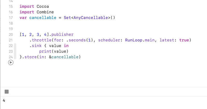 I used delay, between publisher and subscriber. It controlling the timing like debounce and throttle. Above the example, It prints 1, 2, 3, 4 after 3 seconds.