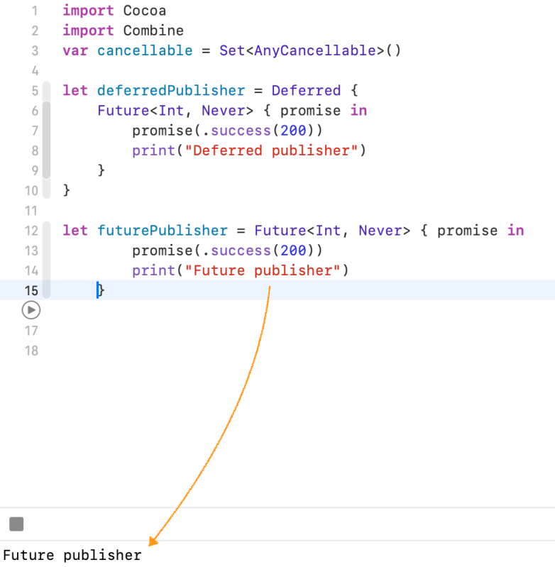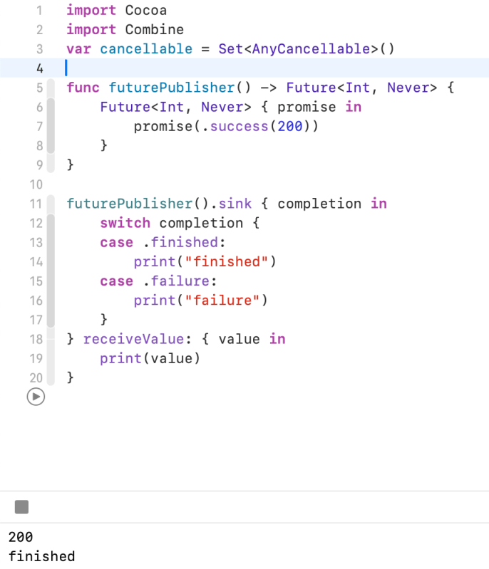 Above the example, when you call a function It create a Future publisher. As you can see Future has finished after send a value (200)