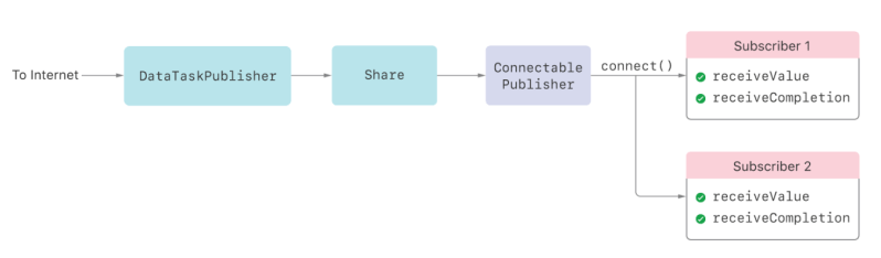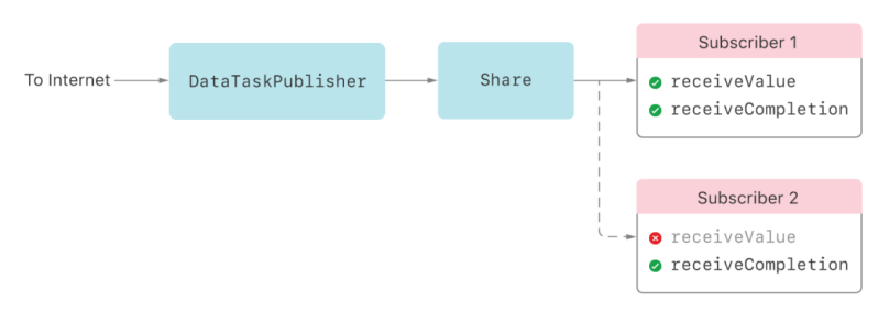 URLSession.DataTaskPublisherand attach a sink subscriber to it (Subscriber 1) which causes the data task to start fetching the URL’s data. At some later point, you attach a second subscriber (Subscriber 2). If the data task completes its download before the second subscriber attaches, the second subscriber misses the data and only sees the completion.