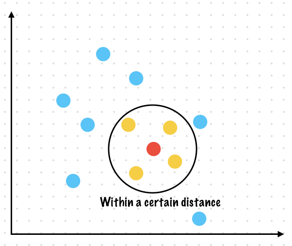Example. All points within a distance 10 of (0,0) will include the point at (3, 4) but not include the point at (12, 13)