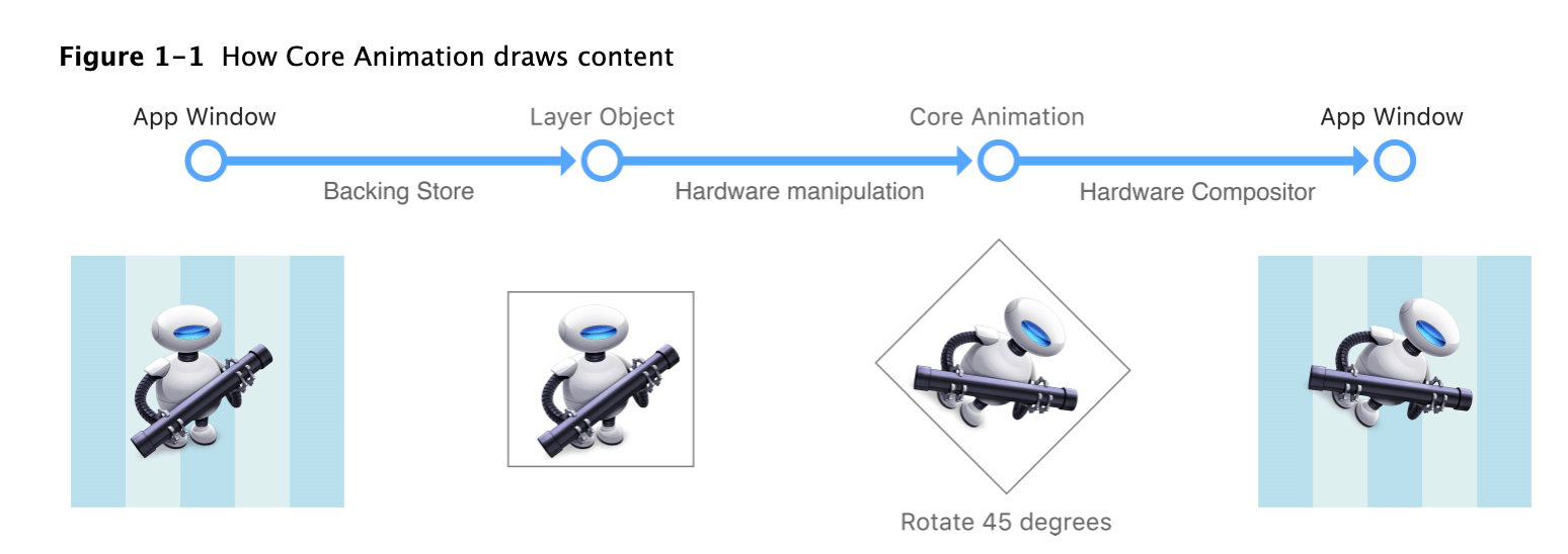 drawRect:method to redraw content using the new parameters. But drawing in this way is expensive because it is done using the CPU on the main thread. Core Animation avoids this expense by whenever possible by manipulating the cached bitmap in hardware to achieve the same or similar effects.Although Core Animation uses cached content as much as possible, your app must still provide the initial content and update it from time to time. There are several ways for your app to provide a layer object with content, which are described in detail in Providing a Layer’s Contents.