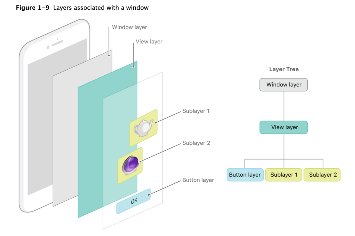 Each set of layer objects is organized into a hierarchical structure like the views in your app. In fact, for an app that enables layers for all of its views, the initial structure of each tree matches the structure of the view hierarchy exactly. However, an app can add additional layer objects—that is, layers not associated with a view—into the layer hierarchy as needed. You might do this in situations to optimize your app’s performance for content that does not require all the overhead of a view. Figure 1-9 shows the breakdown of layers found in a simple iOS app. The window in the example contains a content view, which itself contains a button view and two standalone layer objects. Each view has a corresponding layer object that forms part of the layer hierarchy.