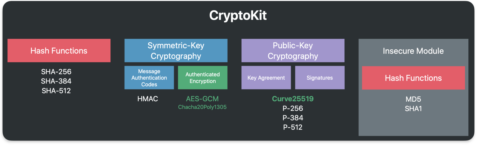 As shown in the image below, you can also use lower level cryptographic resources to create new secure services. Cryptography is difficult and the cost of bugs typically so high that it’s rarely a good idea to implement your own cryptography solution. Rely on the Security framework when you need cryptography in your app.