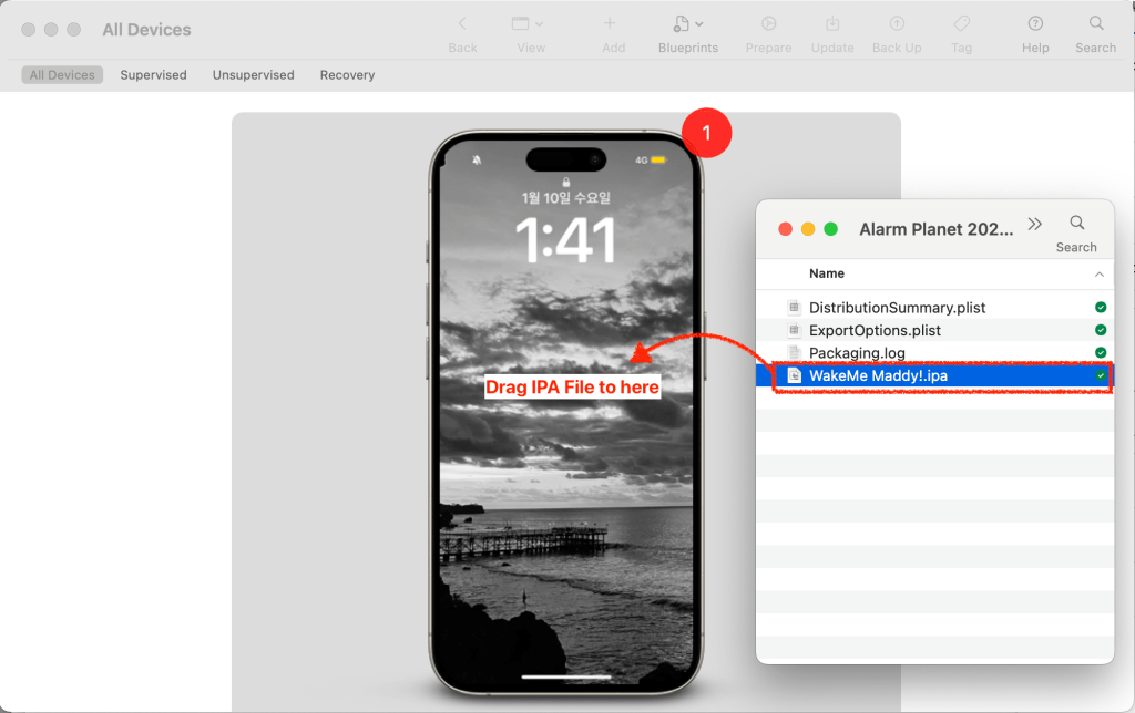 Connect your iPhone into Macbook. In the Apple Configurator app, you may see your connected iPhone screen. Drag IPA file into the your iPhone. That’s it